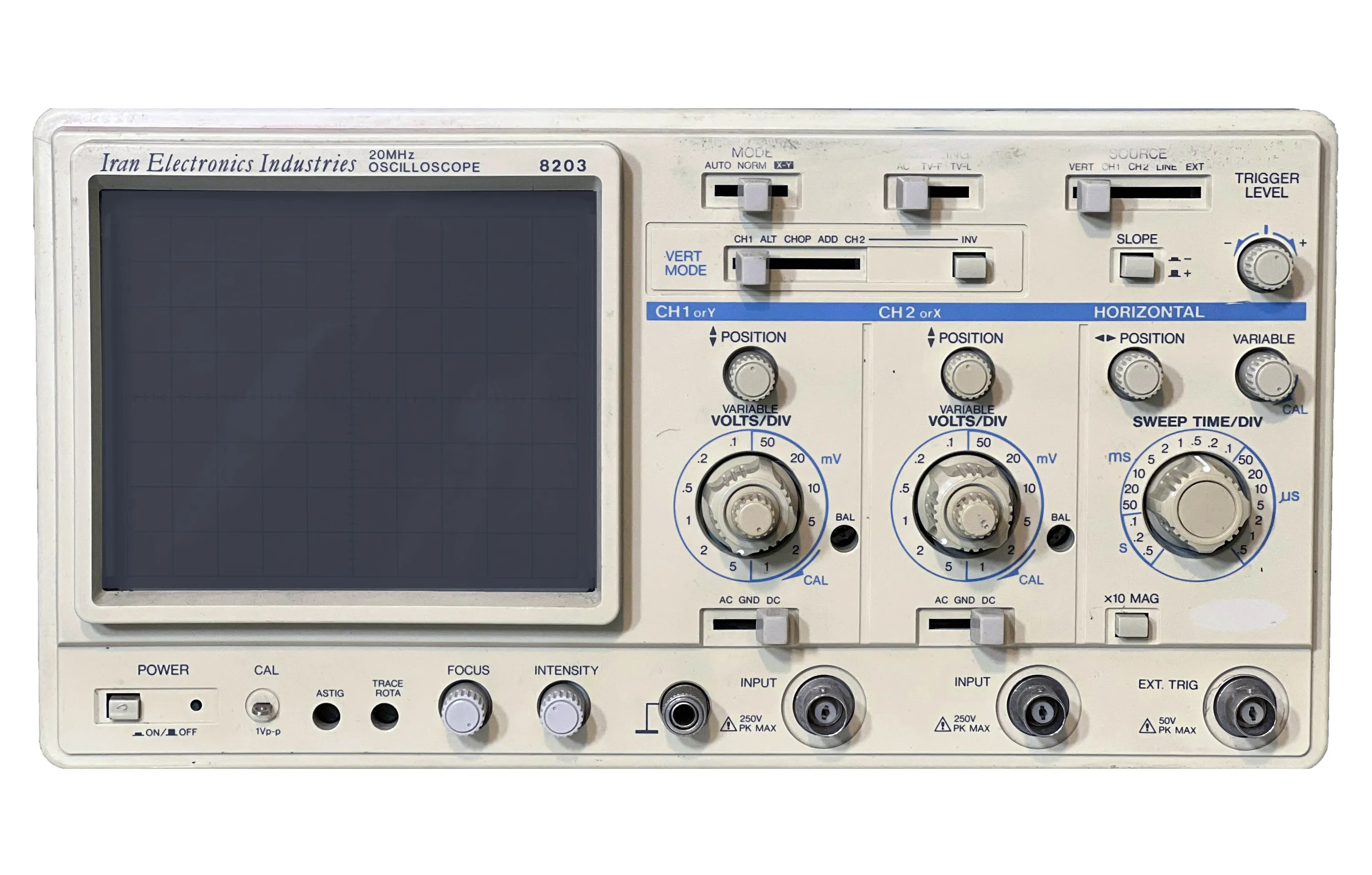 - حساسیت: این اسیلوسکوپ قابلیت اندازهگیری و نمایش سیگنالها با حساسیتهای مختلف (ولتاژهای مختلف) را داراست.