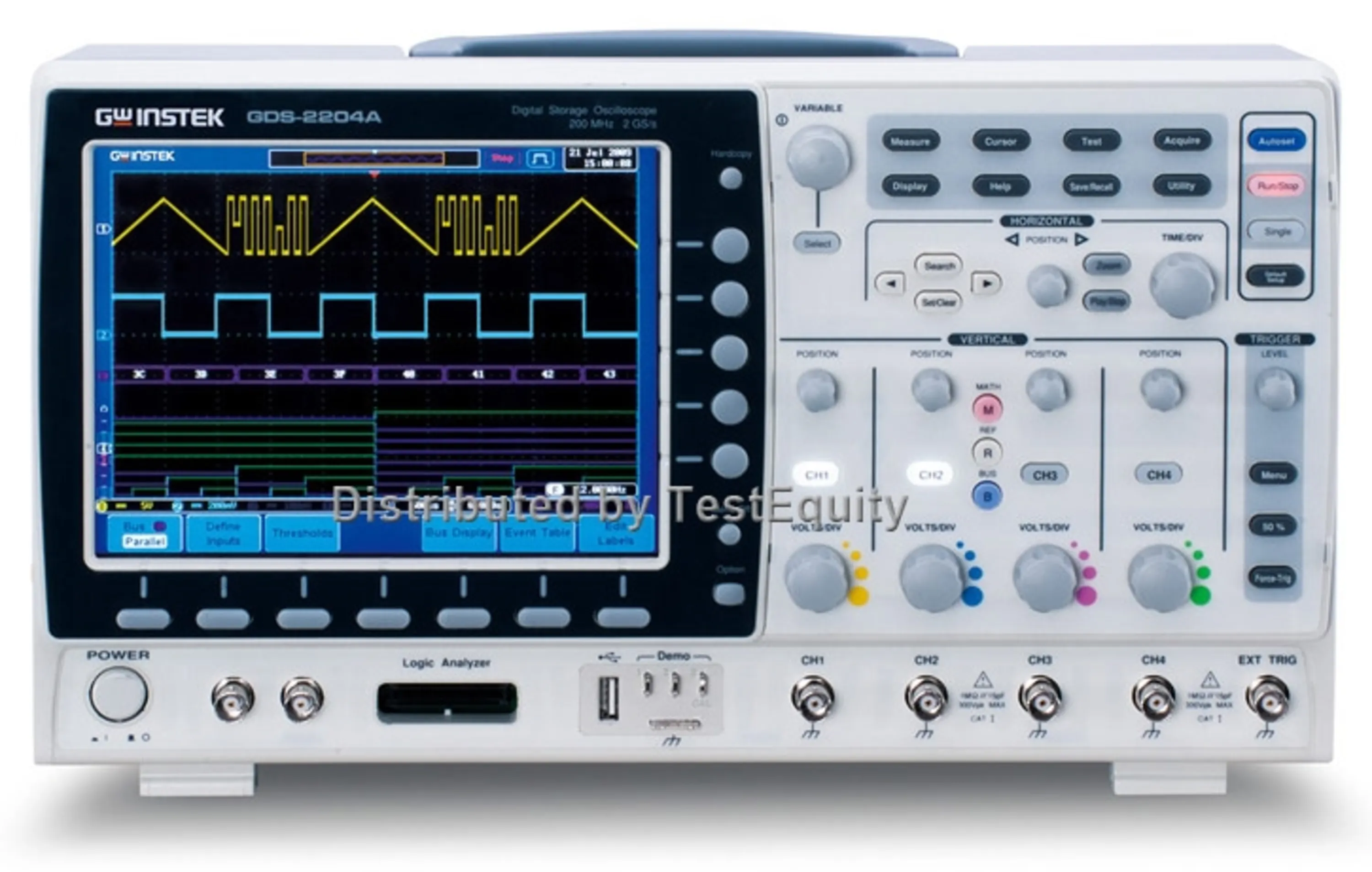 اسیلوسکوپ GDS2204A فرکانس 200 مگاهرتز دارای 4 کانال و حافظه دار می باشد. در ساخت این اسیلوسکوپ از فناوری VPO استفاده شده است. این دستگاه دیجیتالی ساخت GW Instek گودویل تایوان می باشد.