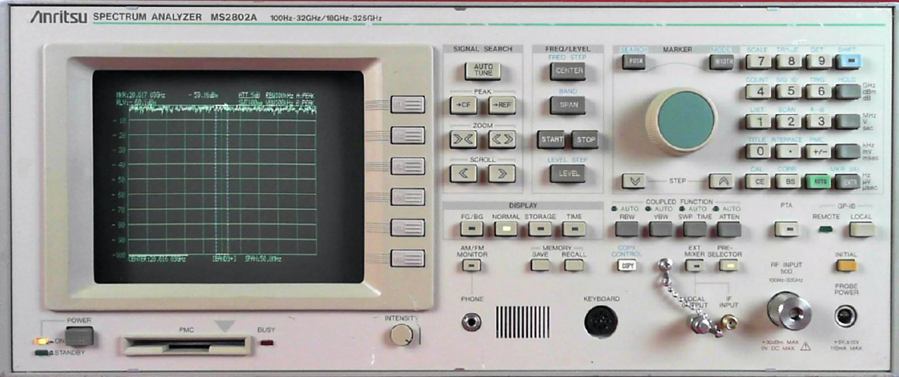 Anritsu MS2802A یک اسپکتروم آنالایزر با محدوده 100 کیلوهرتز تا 32 گیگاهرتز است. اسپکتروم آنالایزر Anritsu MS2802A یک گیرنده باند وسیع و بسیار حساس است. این بر اساس اصل "گیرنده فوق هتروداین" برای تبدیل فرکانس های بالاتر (معمولاً تا چند ثانیه گیگاهرتز) به مقادیر قابل اندازه گیری کار می کند. طیف فرکانس دریافتی به آرامی از میان طیفی از فرکانس های از پیش انتخاب شده عبور می کند و فرکانس انتخابی را به سطح DC قابل اندازه گیری (معمولاً مقیاس لگاریتمی) تبدیل می کند و همان را در CRT Anritsu MS2802A نشان می دهد. CRT قدرت سیگنال دریافتی (محور y) را در برابر فرکانس (محور x) نمایش می دهد.